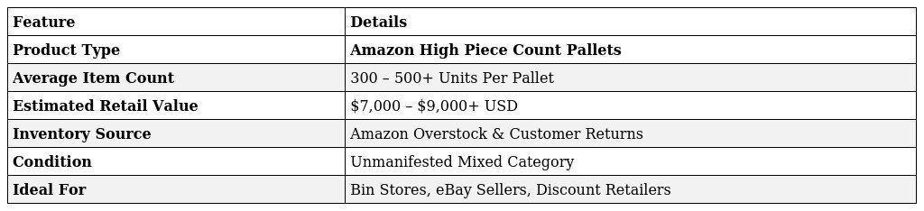- Massive Item Count: Each pallet is expertly packed with 300 to 500+ individual items.